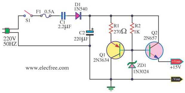 This clever design uses 4 diodes in a bridge to produce a fixed voltage power supply capable of supplying 35mA.