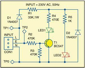 The circuit uses the potential difference across the Neutral and Earth lines. Neutral-to-earth voltage as measured at the load for a single-phase circuit is a function of the load current and the impedance of the neutral wire. Various standards limit this voltage drop in a branch circuit to 3% (5% per cent total for feeder and branch circuit) for a reasonable efficiency of operation. Based on this, the neutral-to-earth voltage limit for a single-phase 120V AC circuit is 3.6V AC and for a single-phase 230V AC circuit 6.6V AC.