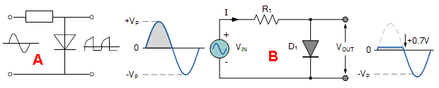 The output waveform of diagram A is entirely incorrect. See the output of diagram B. The max voltage will be 0.7v as the diode turns ON at this voltage and when the waveform goes negative, the diode is effectively “out-of-circuit.”