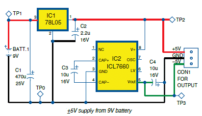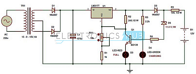 In the circuit above, the 7805 needs 2v across it and if the input voltage falls below 7v, the circuit will not work properly.